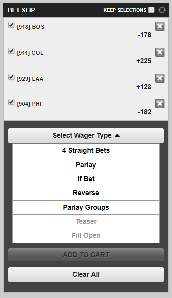 • Keep Selections: The Keep Selections tool was created for the seasoned bettor. First select all the odds that you are interested in. Click the Keep Selections checkbox at the top right. You may then add that bet to the cart using the ADD TO CART button. After that bet has been added to the cart, you can edit your selections and add another bet to the cart. Add as many bets as you want using the combination of selections you’ve created. Then, enter your password and place your bets. Here’s an example of how using the Keep Selections box saves time.